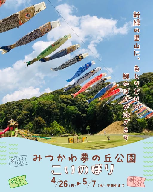 2026.04.22 【みつかわ夢の丘公園こいのぼり】 今年もみつかわ夢の丘公園に鯉のぼりがあげられますぜひ、足をお運びご覧ください 期間:4月26日(日)~5月7日(木)午前中まで 場所:みつかわ夢の丘公園 (袋井市大谷1149-131)