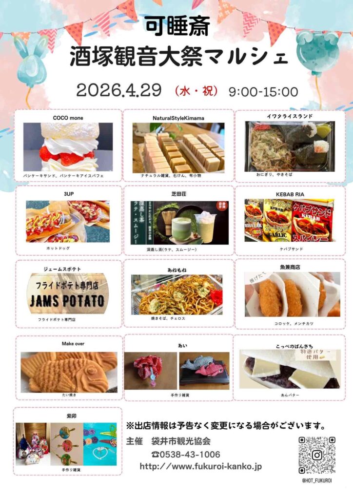 秋葉総本殿可睡斎で行われる酒塚観音大祭に合わせ、「酒塚観音大祭マルシェ」を開催いたします![]()