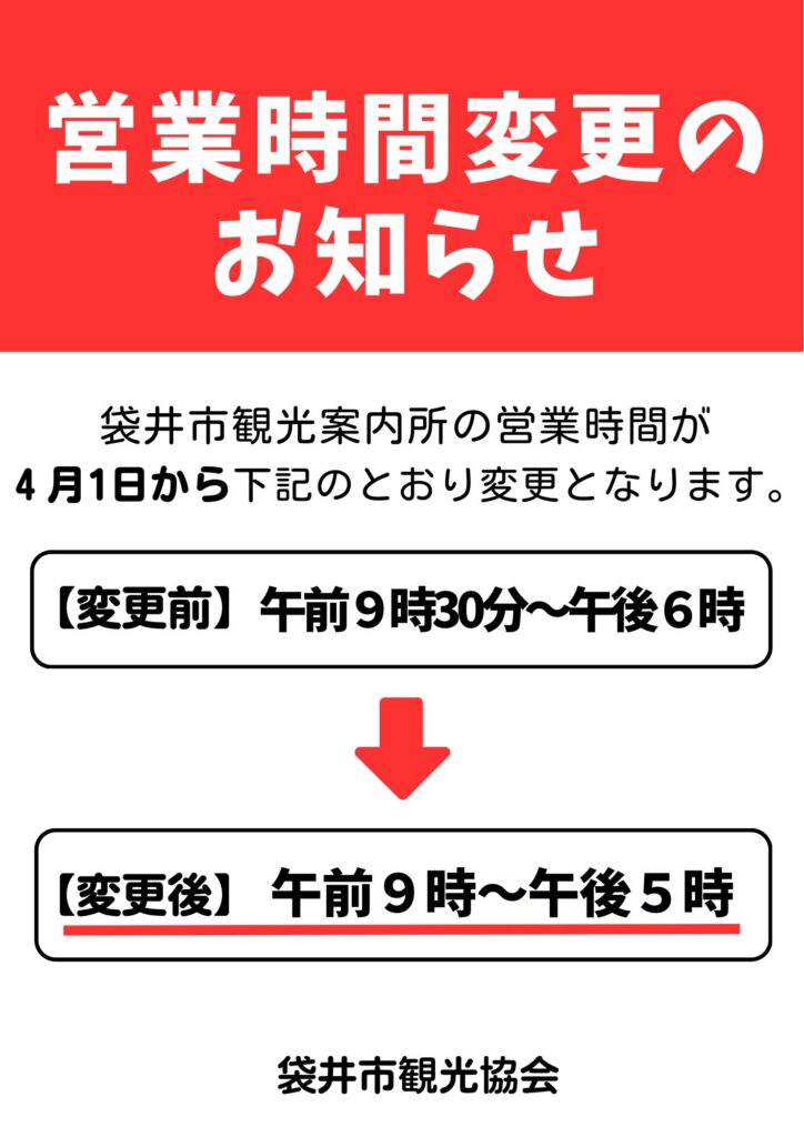 2026.02.17 観光案内所の営業時間変更のお知らせ 袋井市観光案内所の営業時間は、4月1日から下記のとおり変更となります。 変更前:午前9時30分~午後6時変更後:午前9時~午後5時 ご不便をおかけしますが、ご理解のほどよろしくお願いいたします。