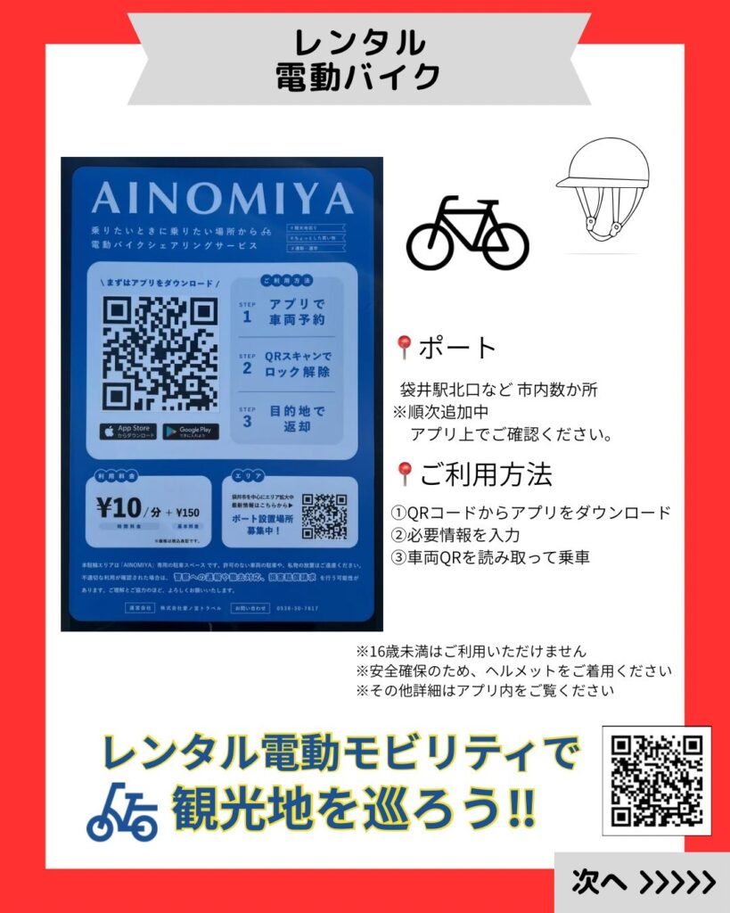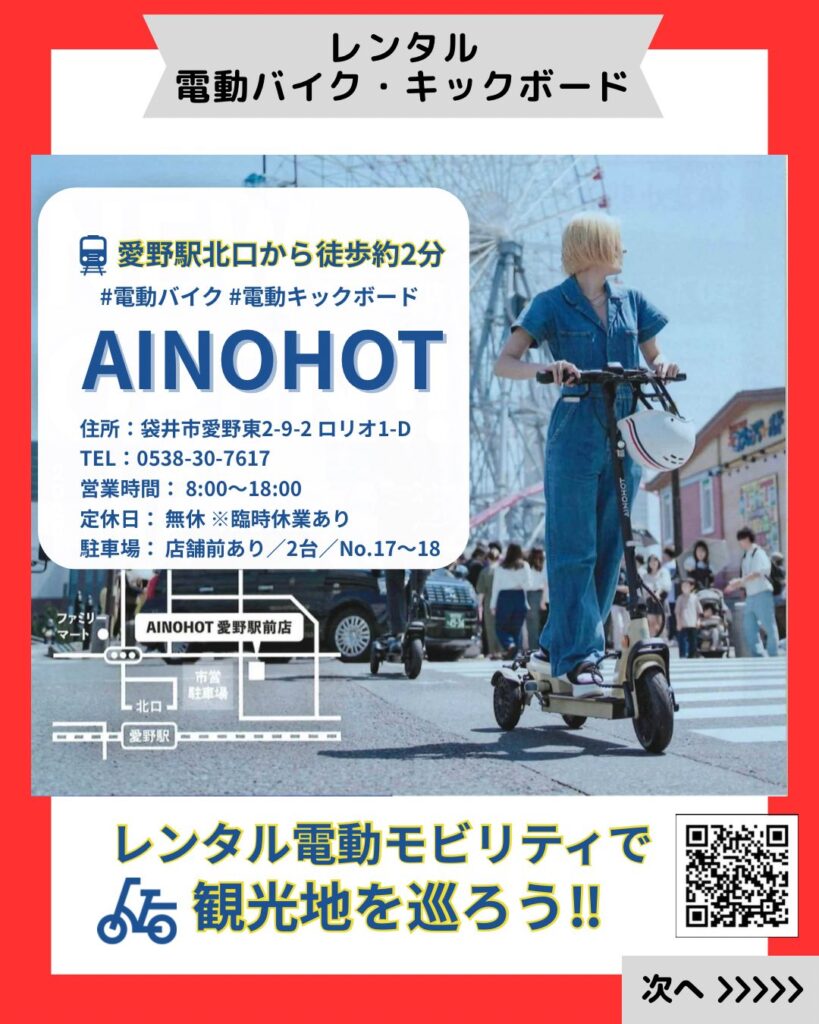愛野駅近くのAINOHOTさんでは、電動バイクやキックボードがレンタルできます。